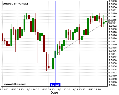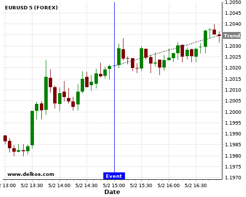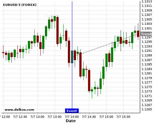 这个概率是根据最近12次公布CA Ivey PMI s.a数据得出的, 12次中有6次真实数据大于专家预期, 这其中有5次导致EURUSD上涨。