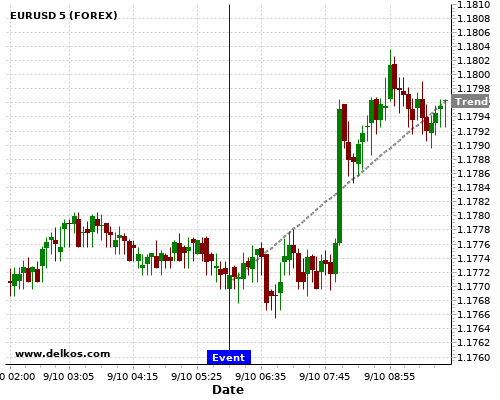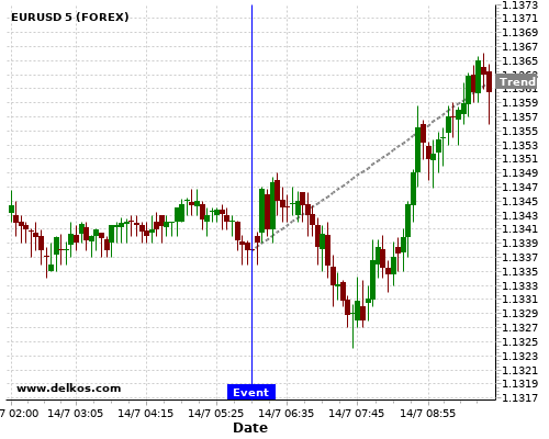 这个概率是根据最近12次公布GB Balance of Trade数据得出的, 12次中有6次真实数据大于专家预期, 这其中有5次导致EURUSD上涨。
