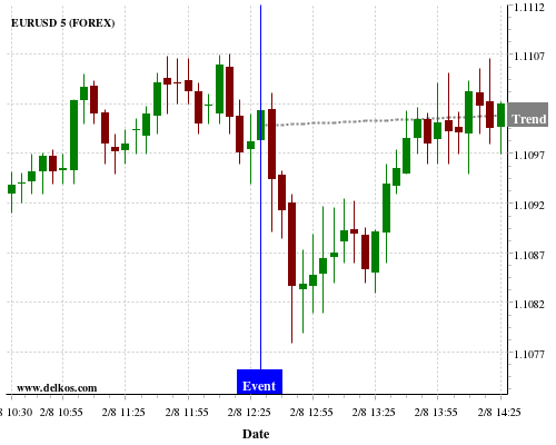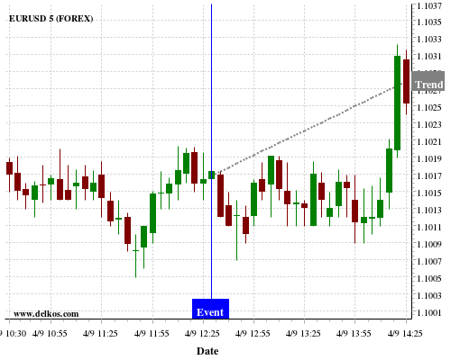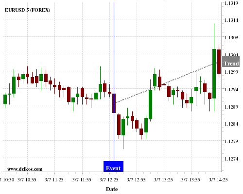 这个概率是根据最近12次公布US Balance of Trade数据得出的, 12次中有6次真实数据小于专家预期, 这其中有5次导致EURUSD上涨。