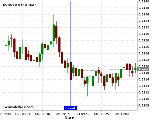 这个概率是根据最近12次公布GB Balance of Trade数据得出的, 12次中有7次真实数据大于专家预期, 这其中有6次导致EURUSD上涨。