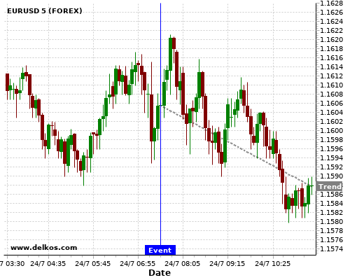 这个概率是根据最近12次公布DE Markit Manufacturing PMI Flash数据得出的, 12次中有8次真实数据大于专家预期, 这其中有7次导致EURUSD下跌。