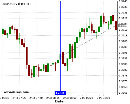 这个概率是根据最近12次公布DE Markit Manufacturing PMI Flash数据得出的, 12次中有9次真实数据大于专家预期, 这其中有7次导致GBPUSD上涨。