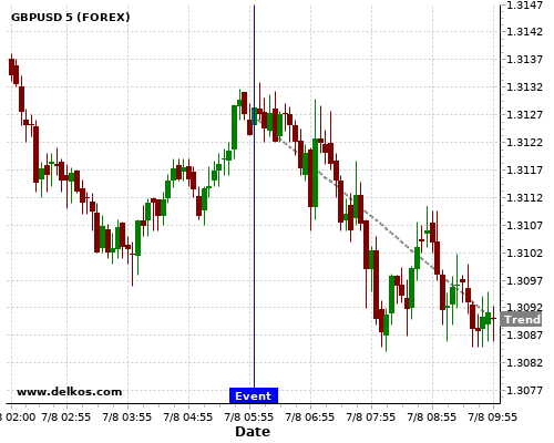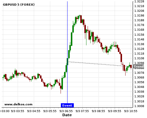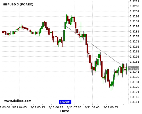 这个概率是根据最近12次公布DE Balance of Trade数据得出的, 12次中有5次真实数据大于专家预期, 这其中有4次导致GBPUSD下跌。