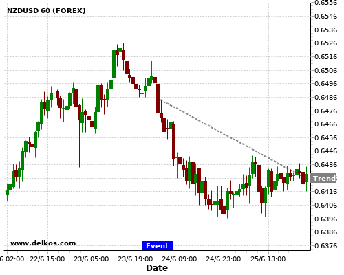 这个概率是根据最近12次公布NZ Interest Rate Decision数据得出的, 12次中有9次真实数据等于专家预期, 这其中有7次导致NZDUSD下跌。