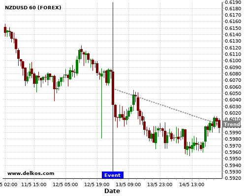 这个概率是根据最近12次公布NZ Interest Rate Decision数据得出的, 12次中有9次真实数据等于专家预期, 这其中有7次导致NZDUSD下跌。