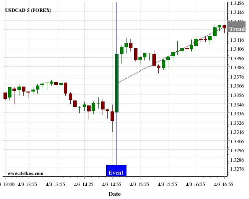 这个概率是根据最近12次公布US ISM Non-Manufacturing PMI数据得出的, 12次中有7次真实数据大于专家预期, 这其中有5次导致USDCAD上涨。