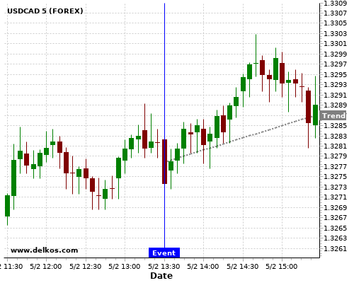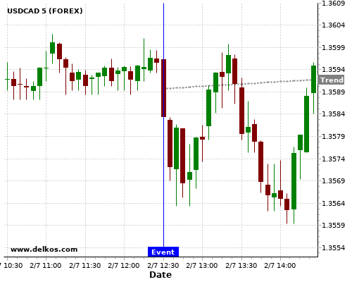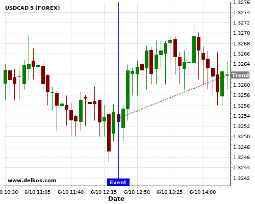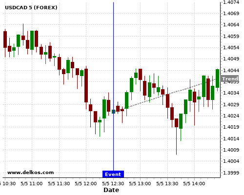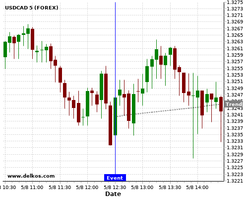 这个概率是根据最近12次公布US Balance of Trade数据得出的, 12次中有7次真实数据小于专家预期, 这其中有5次导致USDCAD上涨。