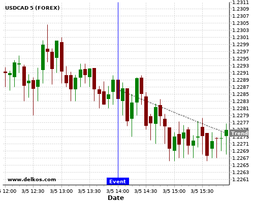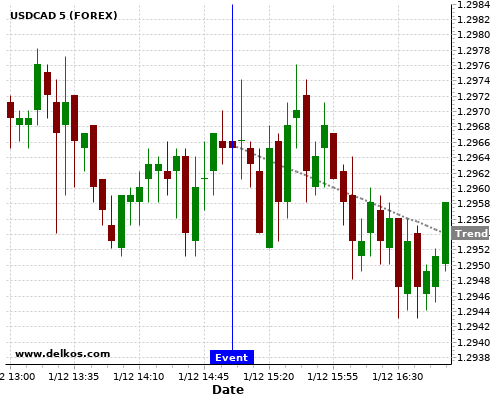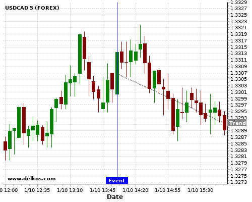 这个概率是根据最近12次公布US ISM Manufacturing PMI数据得出的, 12次中有4次真实数据小于专家预期, 这其中有3次导致USDCAD下跌。