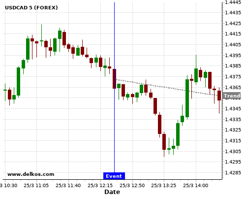 这个概率是根据最近12次公布US Durable Goods Orders MoM数据得出的, 12次中有9次真实数据大于专家预期, 这其中有7次导致USDCAD下跌。