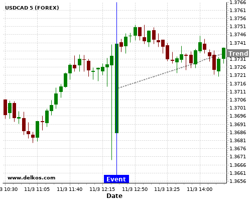这个概率是根据最近12次公布US Inflation Rate YoY数据得出的, 12次中有5次真实数据大于专家预期, 这其中有1次导致USDCAD上涨。