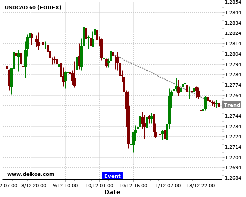 这个概率是根据最近12次公布GB Balance of Trade数据得出的, 12次中有6次真实数据小于专家预期, 这其中有5次导致USDCAD下跌。