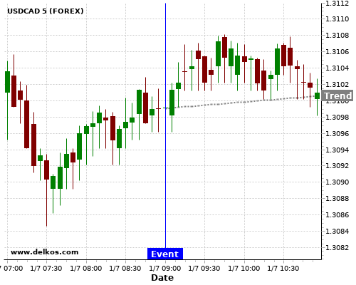 这个概率是根据最近12次公布EMU Unemployment Rate数据得出的, 12次中有6次真实数据小于专家预期, 这其中有5次导致USDCAD上涨。