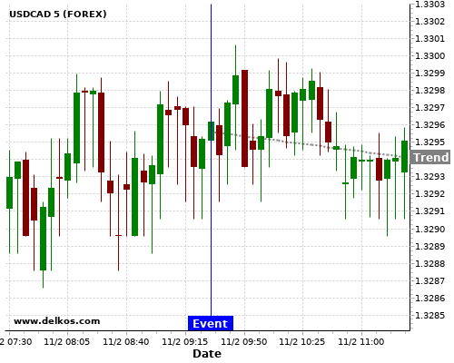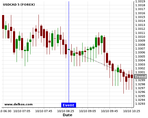 这个概率是根据最近12次公布GB Balance of Trade数据得出的, 12次中有8次真实数据大于专家预期, 这其中有4次导致USDCAD下跌。