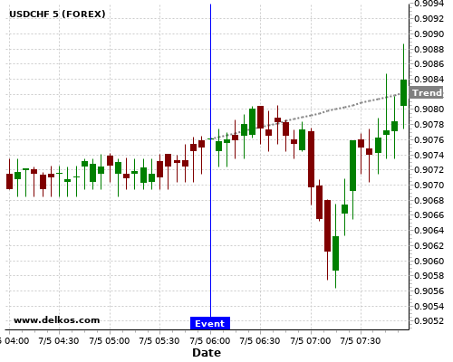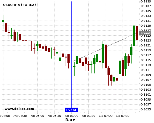 这个概率是根据最近12次公布DE Balance of Trade数据得出的, 12次中有4次真实数据大于专家预期, 这其中有3次导致USDCHF上涨。