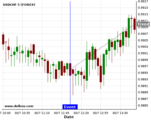 这个概率是根据最近12次公布DE Inflation Rate YoY Prel数据得出的, 12次中有4次真实数据大于专家预期, 这其中有3次导致USDCHF上涨。