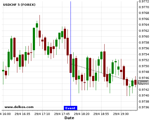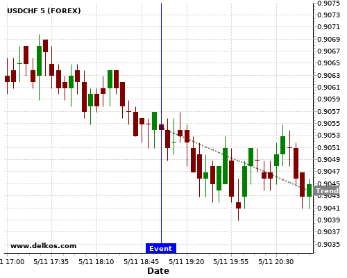 这个概率是根据最近12次公布US Fed Interest Rate Decision数据得出的, 12次中有12次真实数据等于专家预期, 这其中有9次导致USDCHF下跌。