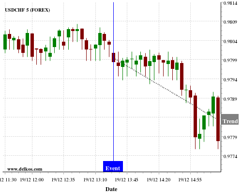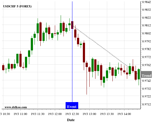 这个概率是根据最近12次公布US Philadelphia Fed Manufacturing Index数据得出的, 12次中有5次真实数据小于专家预期, 这其中有4次导致USDCHF下跌。