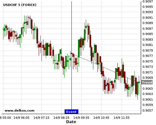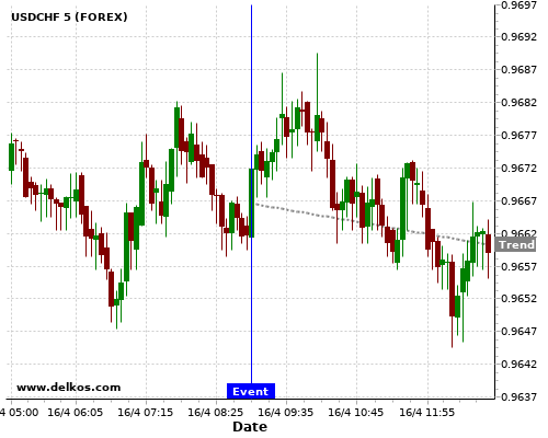 这个概率是根据最近12次公布EMU Industrial Production YoY数据得出的, 12次中有5次真实数据大于专家预期, 这其中有4次导致USDCHF下跌。
