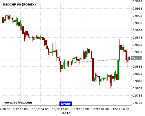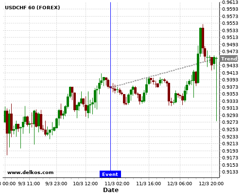 这个概率是根据最近12次公布AU Westpac Consumer Confidence Index数据得出的, 12次中有6次真实数据小于专家预期, 这其中有5次导致USDCHF上涨。