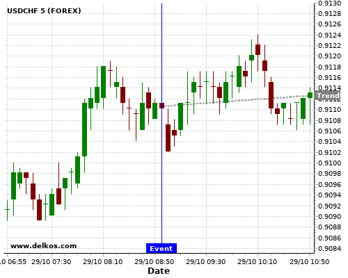 这个概率是根据最近12次公布DE Unemployment Rate数据得出的, 12次中有6次真实数据小于专家预期, 这其中有5次导致USDCHF上涨。