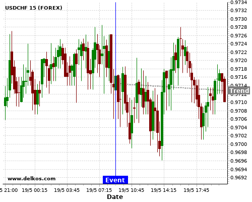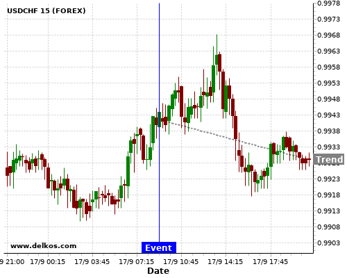 这个概率是根据最近12次公布DE ZEW Economic Sentiment Index数据得出的, 12次中有7次真实数据大于专家预期, 这其中有6次导致USDCHF下跌。