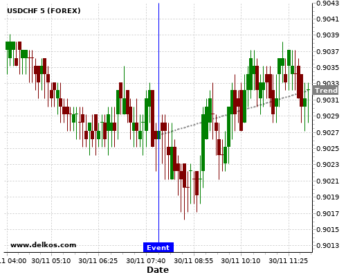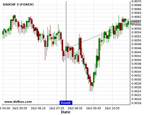 这个概率是根据最近12次公布CH KOF Leading Indicators数据得出的, 12次中有7次真实数据大于专家预期, 这其中有6次导致USDCHF上涨。