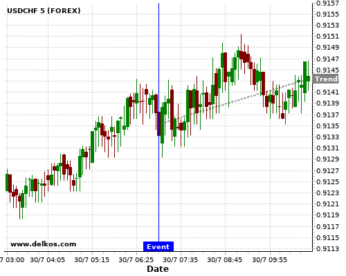 这个概率是根据最近12次公布CH KOF Leading Indicators数据得出的, 12次中有8次真实数据大于专家预期, 这其中有7次导致USDCHF上涨。
