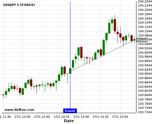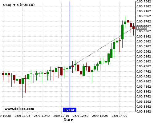 这个概率是根据最近12次公布US Durable Goods Orders MoM数据得出的, 12次中有4次真实数据小于专家预期, 这其中有3次导致USDJPY上涨。