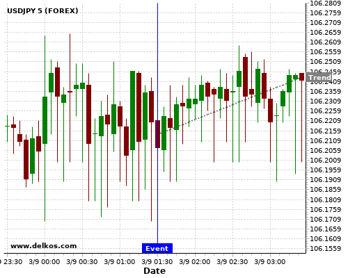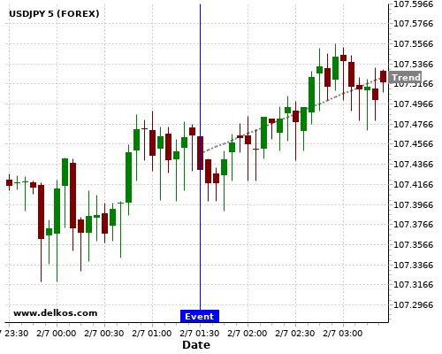 这个概率是根据最近12次公布AU Balance of Trade数据得出的, 12次中有5次真实数据小于专家预期, 这其中有4次导致USDJPY上涨。