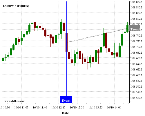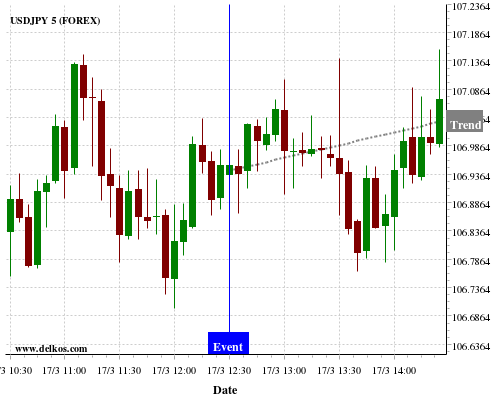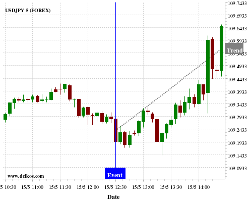 这个概率是根据最近12次公布US Retail Sales MoM数据得出的, 12次中有6次真实数据小于专家预期, 这其中有5次导致USDJPY上涨。