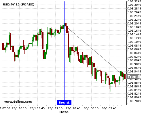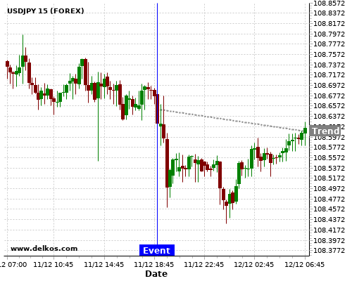 这个概率是根据最近12次公布US Fed Interest Rate Decision数据得出的, 12次中有12次真实数据等于专家预期, 这其中有10次导致USDJPY下跌。