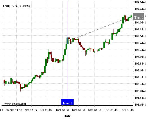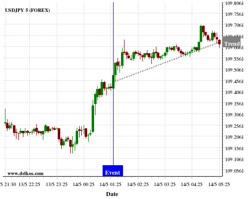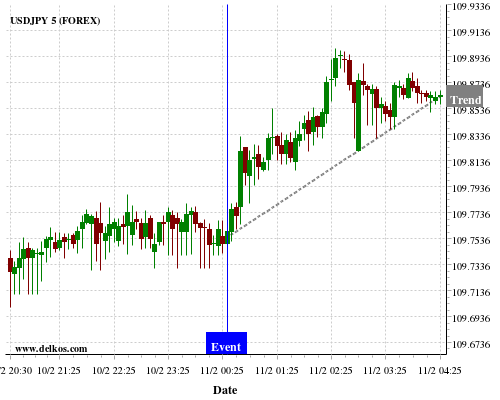 这个概率是根据最近12次公布AU NAB Business Confidence数据得出的, 12次中有7次真实数据小于专家预期, 这其中有6次导致USDJPY上涨。
