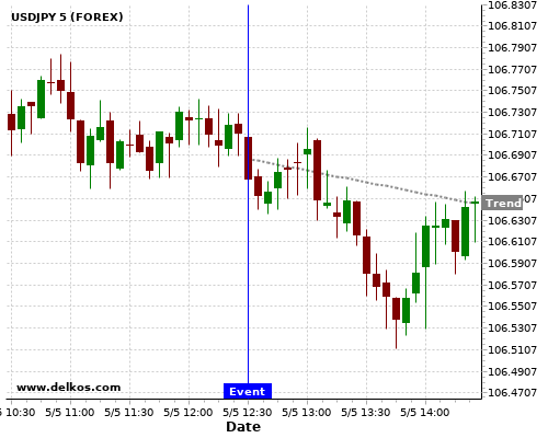 这个概率是根据最近12次公布US Balance of Trade数据得出的, 12次中有10次真实数据小于专家预期, 这其中有9次导致USDJPY下跌。