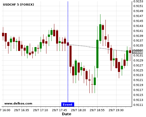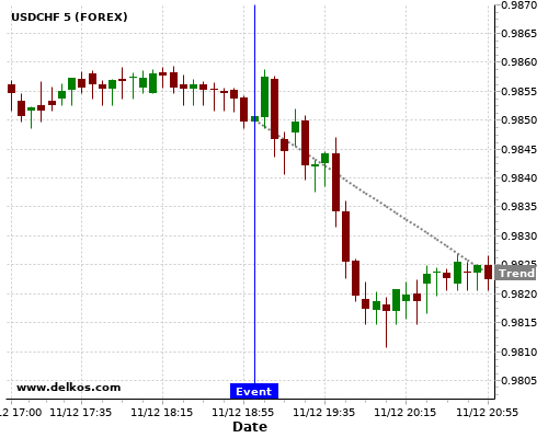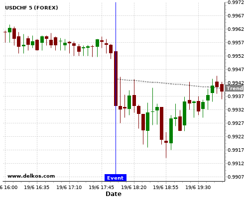 这个可能性是根据最近12次公布US Fed Interest Rate Decision数据得出的,12次中有12次真实数据等于专家预期,这其中有9次导致USDCHF下跌。