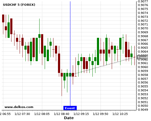 这个可能性是根据最近12次公布DE Unemployment Rate数据得出的,12次中有6次真实数据小于专家预期,这其中有5次导致USDCHF上涨。