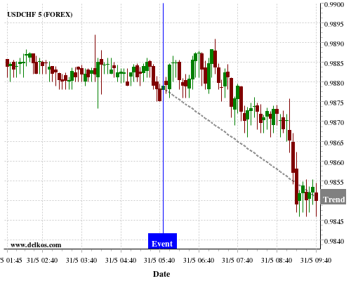 如果该数据大于专家预期,那么USDCHF在消息公布之后的四小时内,将有83.33%的可能性会下跌。