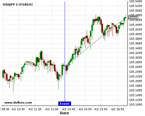 如果该数据小于专家预期,那么USDJPY在消息公布之后的四小时内,将有83.33%的可能性会上涨。
