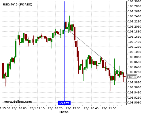 这个可能性是根据最近12次公布US Fed Interest Rate Decision数据得出的,12次中有12次真实数据等于专家预期,这其中有9次导致USDJPY下跌。