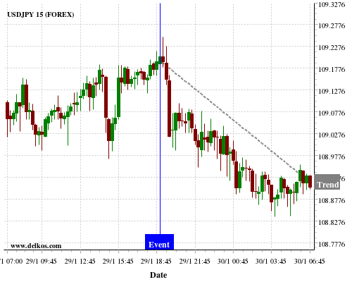 这个可能性是根据最近12次公布US Fed Interest Rate Decision数据得出的,12次中有12次真实数据等于专家预期,这其中有10次导致USDJPY下跌。