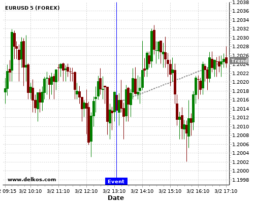 这个可能性是根据最近12次公布US ADP Employment Change数据得出的,12次中有4次真实数据大于专家预期,这其中有3次导致EURUSD上涨。