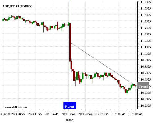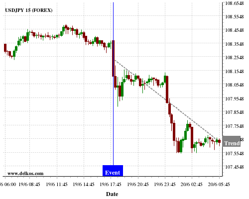 这个可能性是根据最近12次公布US Fed Interest Rate Decision数据得出的,12次中有12次真实数据等于专家预期,这其中有10次导致USDJPY下跌。