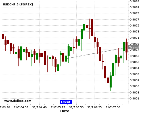 这个可能性是根据最近12次公布FR GDP Growth Rate QoQ Prel数据得出的,12次中有5次真实数据大于专家预期,这其中有4次导致USDCHF上涨。