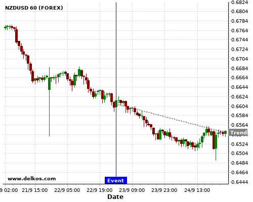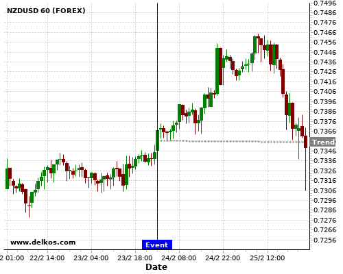 这个可能性是根据最近12次公布NZ Interest Rate Decision数据得出的,12次中有9次真实数据等于专家预期,这其中有7次导致NZDUSD下跌。