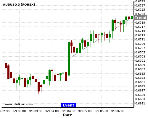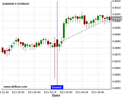 这个可能性是根据最近12次公布AU RBA Interest Rate Decision数据得出的,12次中有11次真实数据等于专家预期,这其中有9次导致AUDUSD上涨。