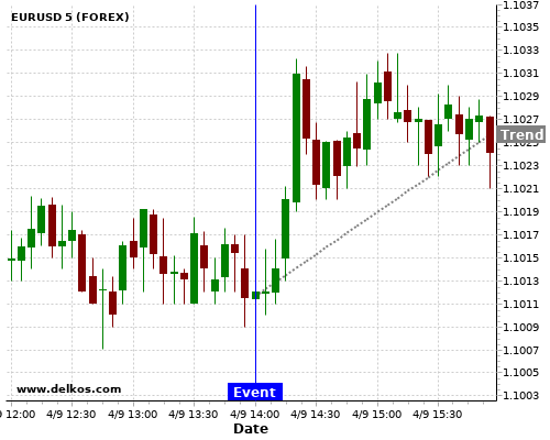 如果该数据等于专家预期,那么EURUSD在消息公布之后的四小时内,将有81.81%的可能性会上涨。