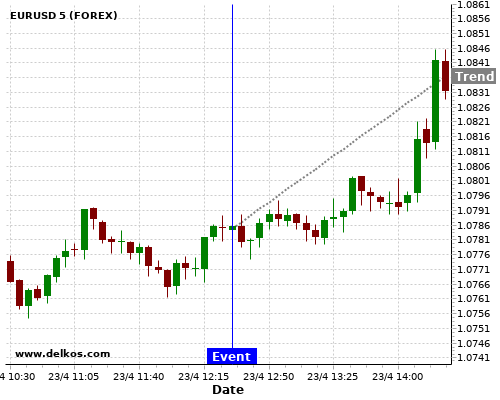 如果该数据小于专家预期,那么EURUSD在消息公布之后的四小时内,将有75%的可能性会上涨。