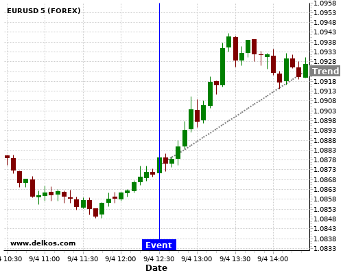 如果该数据小于专家预期,那么EURUSD在消息公布之后的四小时内,将有75%的可能性会上涨。