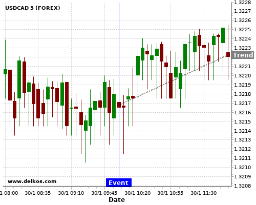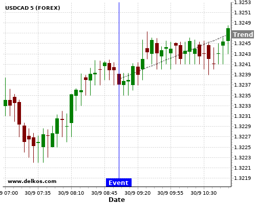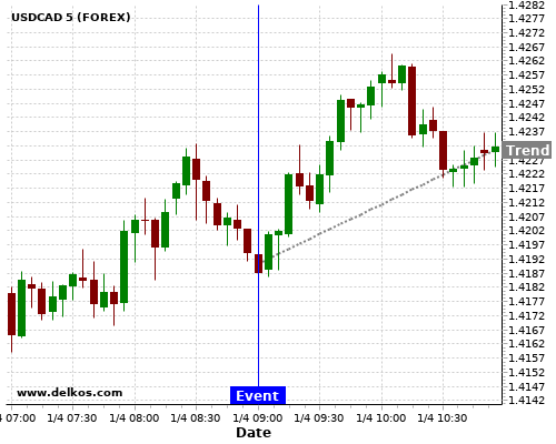如果该数据小于专家预期,那么USDCAD在消息公布之后的四小时内,将有83.33%的可能性会上涨。