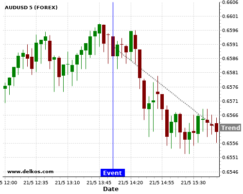 这个可能性是根据最近12次公布US Existing Home Sales数据得出的,12次中有6次真实数据大于专家预期,这其中有5次导致AUDUSD下跌。