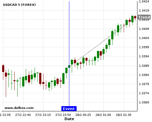如果该数据大于专家预期,那么USDCAD在消息公布之后的四小时内,将有85.71%的可能性会上涨。